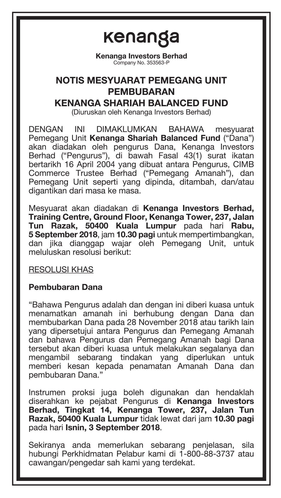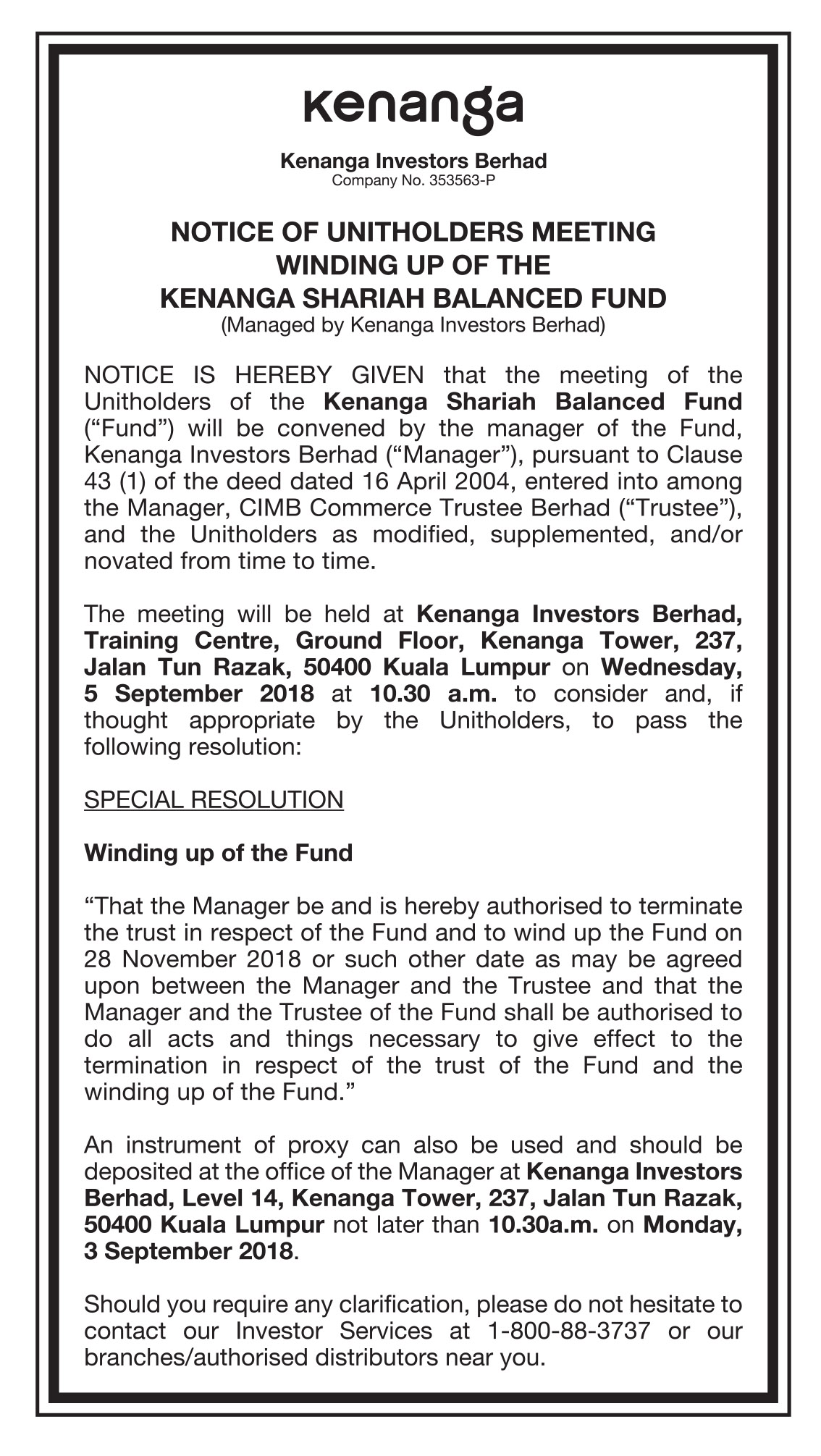 This is to inform the relevant unitholders, of the Unitholders Meeting to wind up the Kenanga Shariah Balanced Fund. If you have not received an official letter of notification from us, please contact Investor Services at 1800-88-3737.